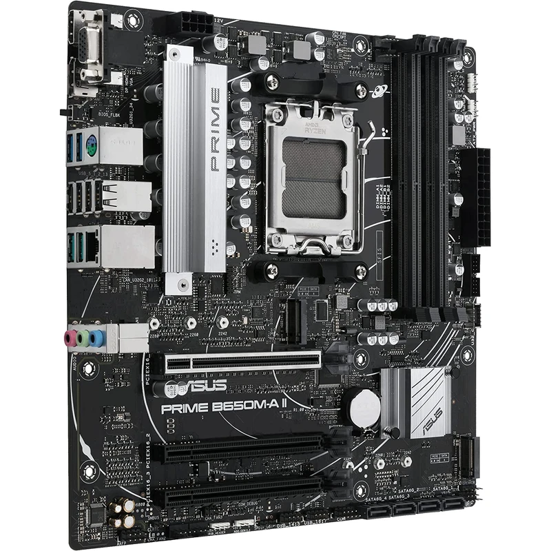 مادربرد PRIME B650M-A II با طراحی مشکی-نقرهای صنعتی، ظاهر مدرن و حرفهای را برای داخل کیس فراهم میسازد. ساختار Micro-ATX آن، امکان استفاده در کیسهای کوچکتر را بدون قربانی کردن امکانات فراهم میکند.